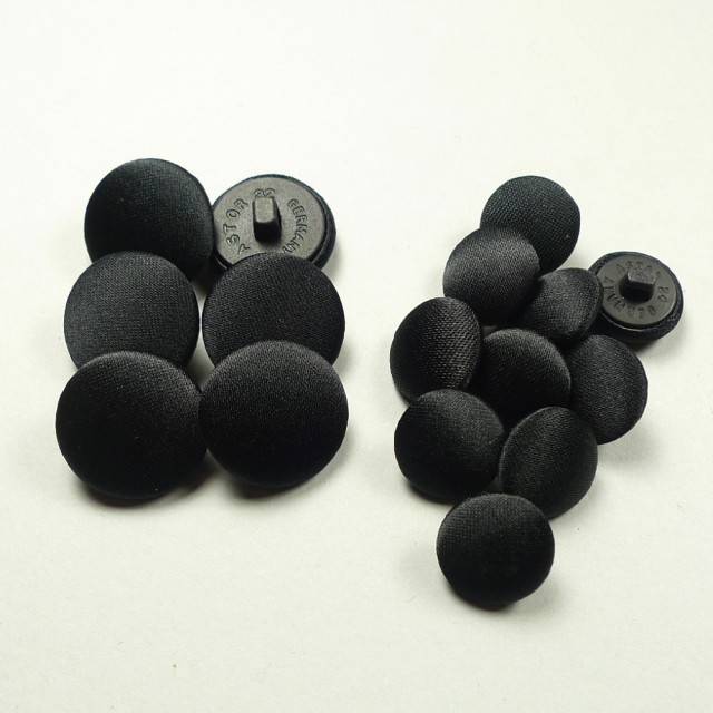 Sett med store og små silkeknapper, halvmatte, mest brukte størrelser i f.eks. smoking. Sort bakstykke.