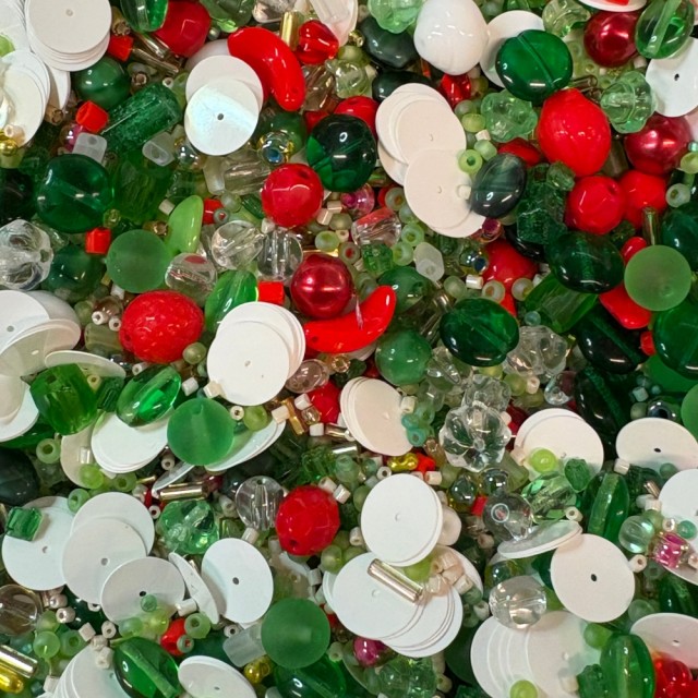 Fin blanding me glassperler i julefarger og hvite paljetter. 100g
