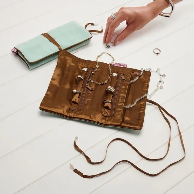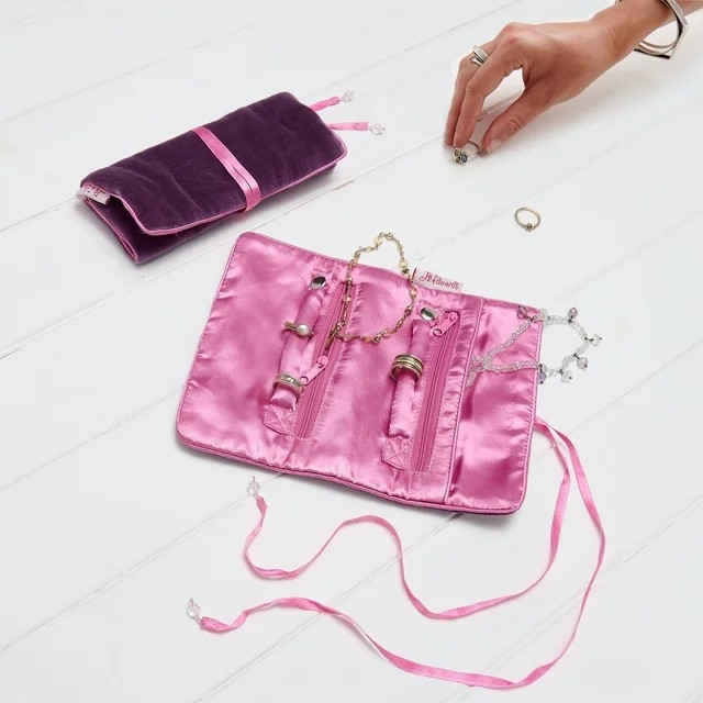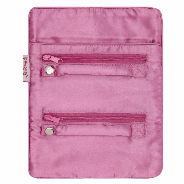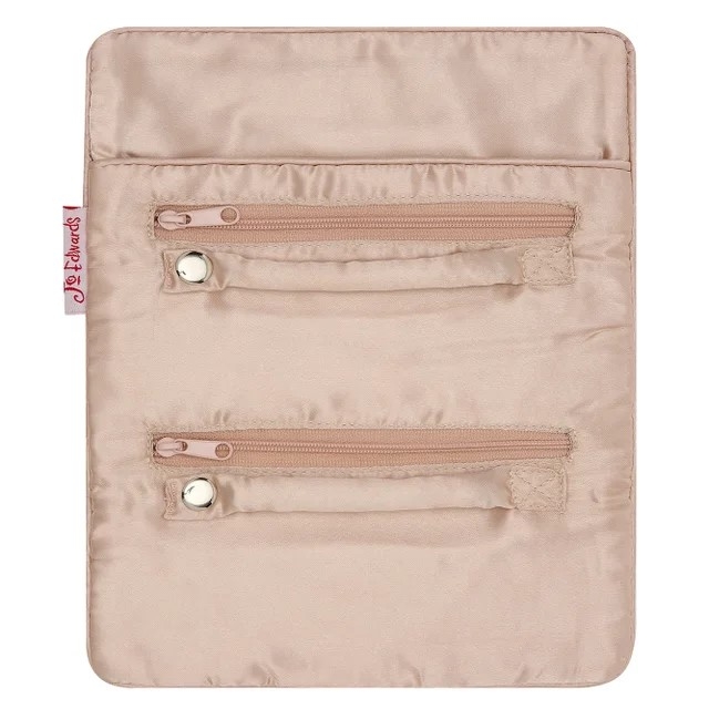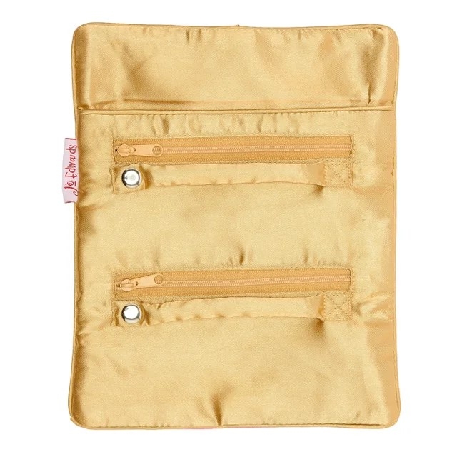 Luksuriøs, myk fløyelsetui å ha smykker i, kjekt å oppbevare dine smykkefavoritter både hjemme og på reiser. Foret med silkestoff, har 3 lommer og 3 ringpinner med trykknapp.