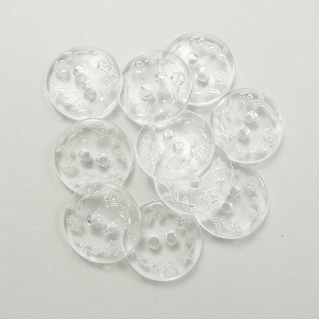 Klare plastknapper, 2 hull, med rosemønster. 18mm 10 stk.