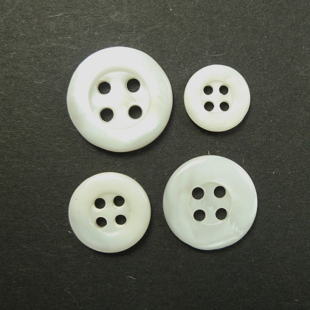 Solide, hvite skjellknapper, 4 hull, 4 størrelser.