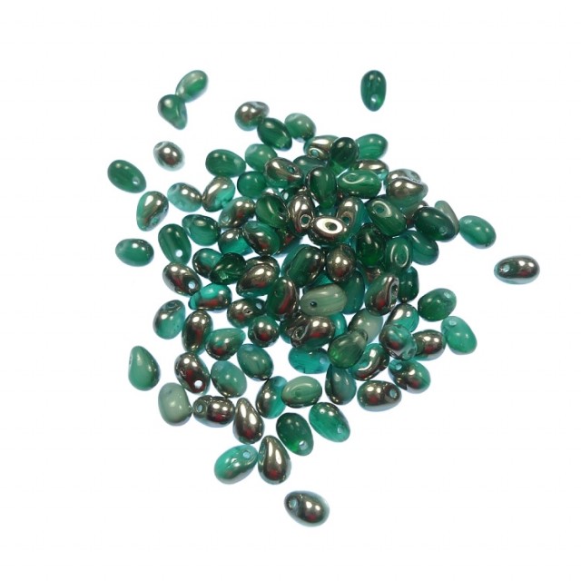 Perler, små glassdråper, mørke grønne, med sølv, 4x6mm, ca.45-50 stk, 10g