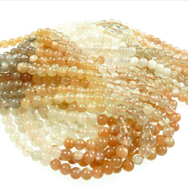 Steinperler, månesten, nydelig fargemiks, runde kuler 5.5mm, ikke fasett, prisen er for 1 hel streng med ca 65 stener.