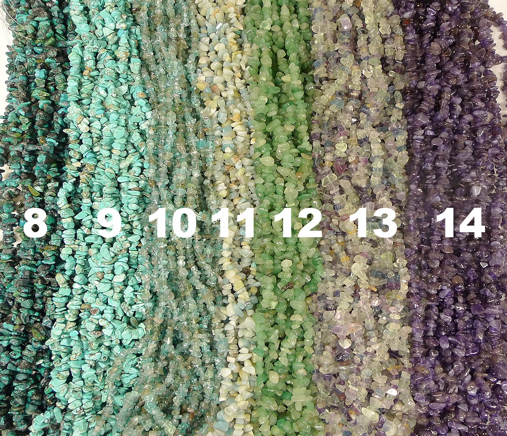 Fine lange rader med chips, forskjellige typer stener, lengde 80 cm (unntak fra standard lengde angis nedenfor). Litt forskjellige størrelser og helt umulig å måle, fra ca 8 til 12mm.