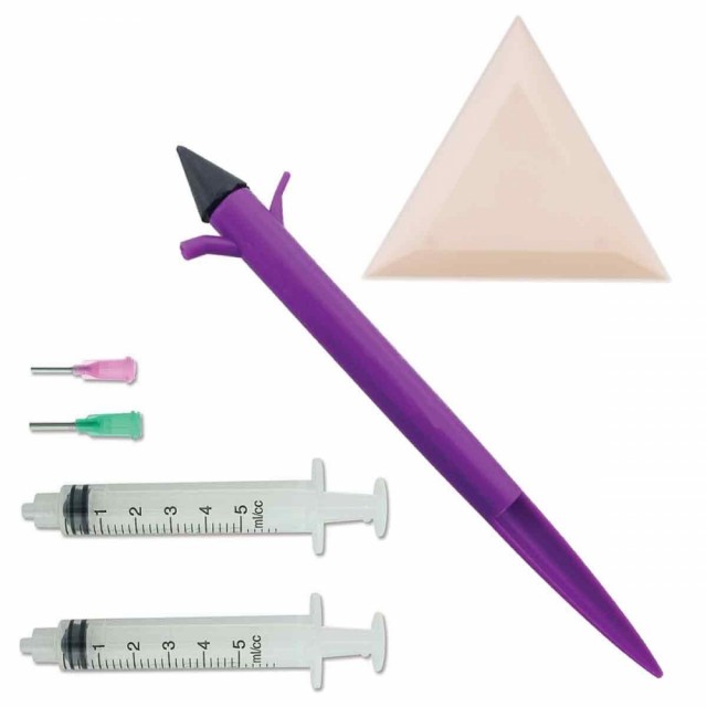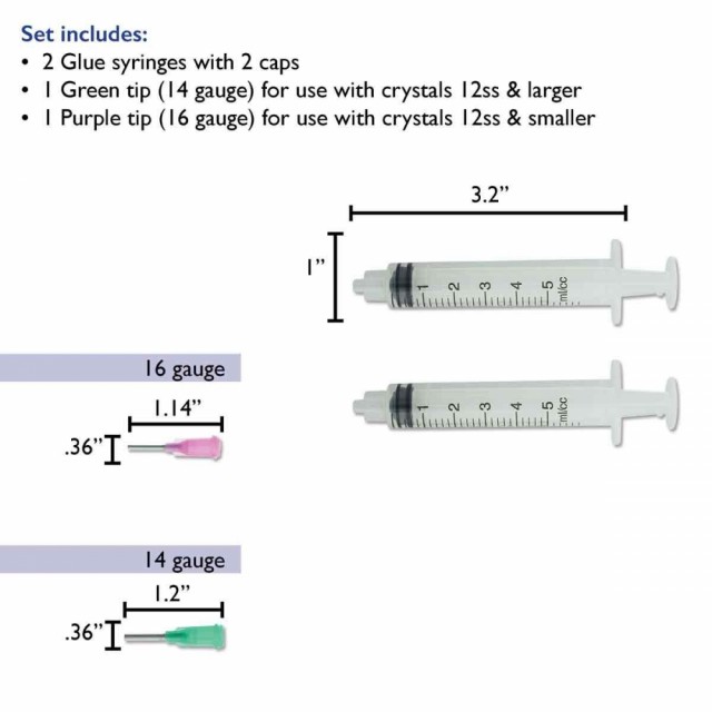 Sett med hjelpemidler til å lime flat back krystaller, sortere, løfte dem og lime. Den lille trekanten ristes med krystaller på og de legger seg alltid med forsiden opp. Pennen fester krystllaer og brukes til å løfte og plassere dem. Sprøytene kan brukes med lim for lettere å lime små krystaller.
