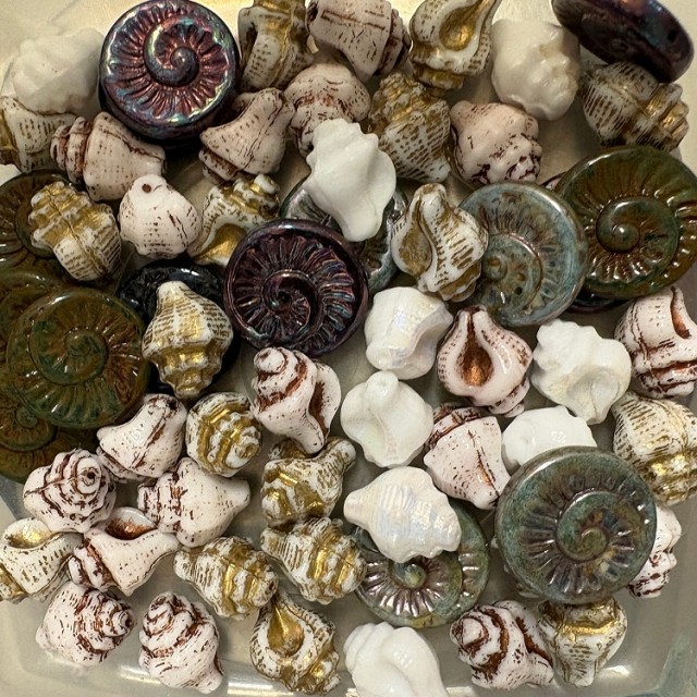 Pressede glassperler, skjell, FARGEMIKS, prisen er for 100g.